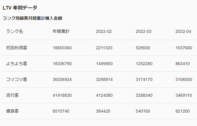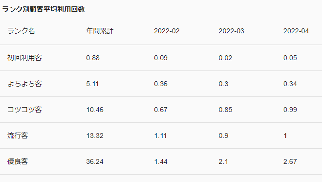 また、どのランク帯の売り上げ構成比率が高いかが分かるので、お客様をどのランク帯まで育てるかが店舗運営上のキーアクションとなりますね!