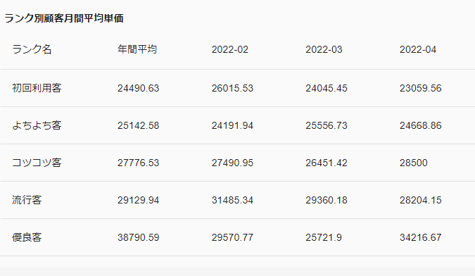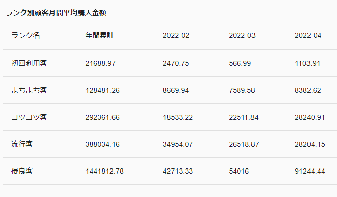 ランク別平均購入金額は年間で顧客ランク毎にどれくらい、売り上げに貢献しているかがわかります。