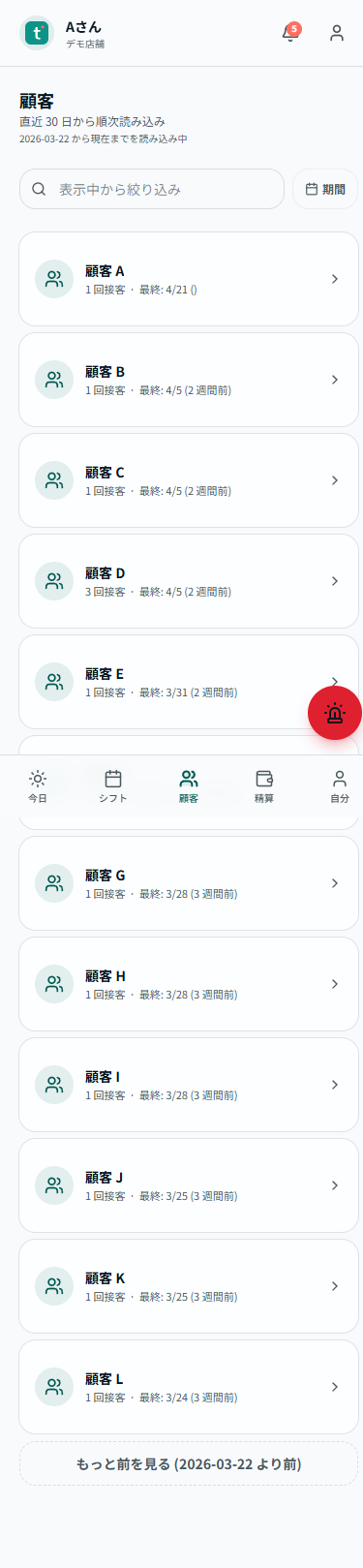 キャスト向けモバイルアプリを全面刷新。5 タブ構成の新 UI を β 公開しました。今日の予約・シフト・顧客・精算・設定を最短 1 タップで。既存ユーザーは Top 画面のバナーから切り替え可能です。