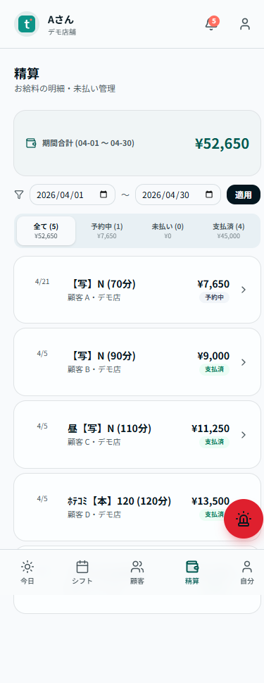 | 精算 | 予約中 / 未払い / 支払済タブ、期間合計、接客中バッジ |