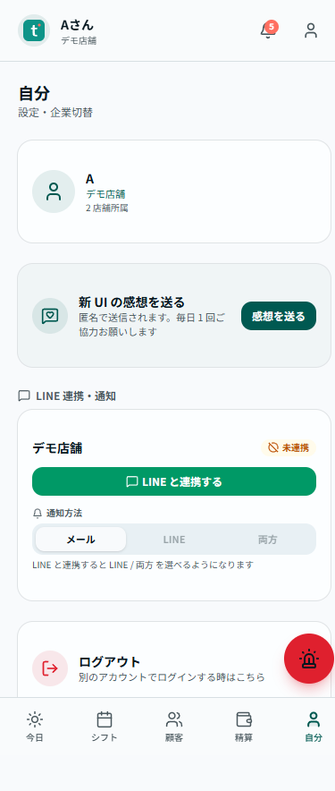 | 自分 | プロフィール、企業切替、LINE 連携、通知設定、感想送信 |